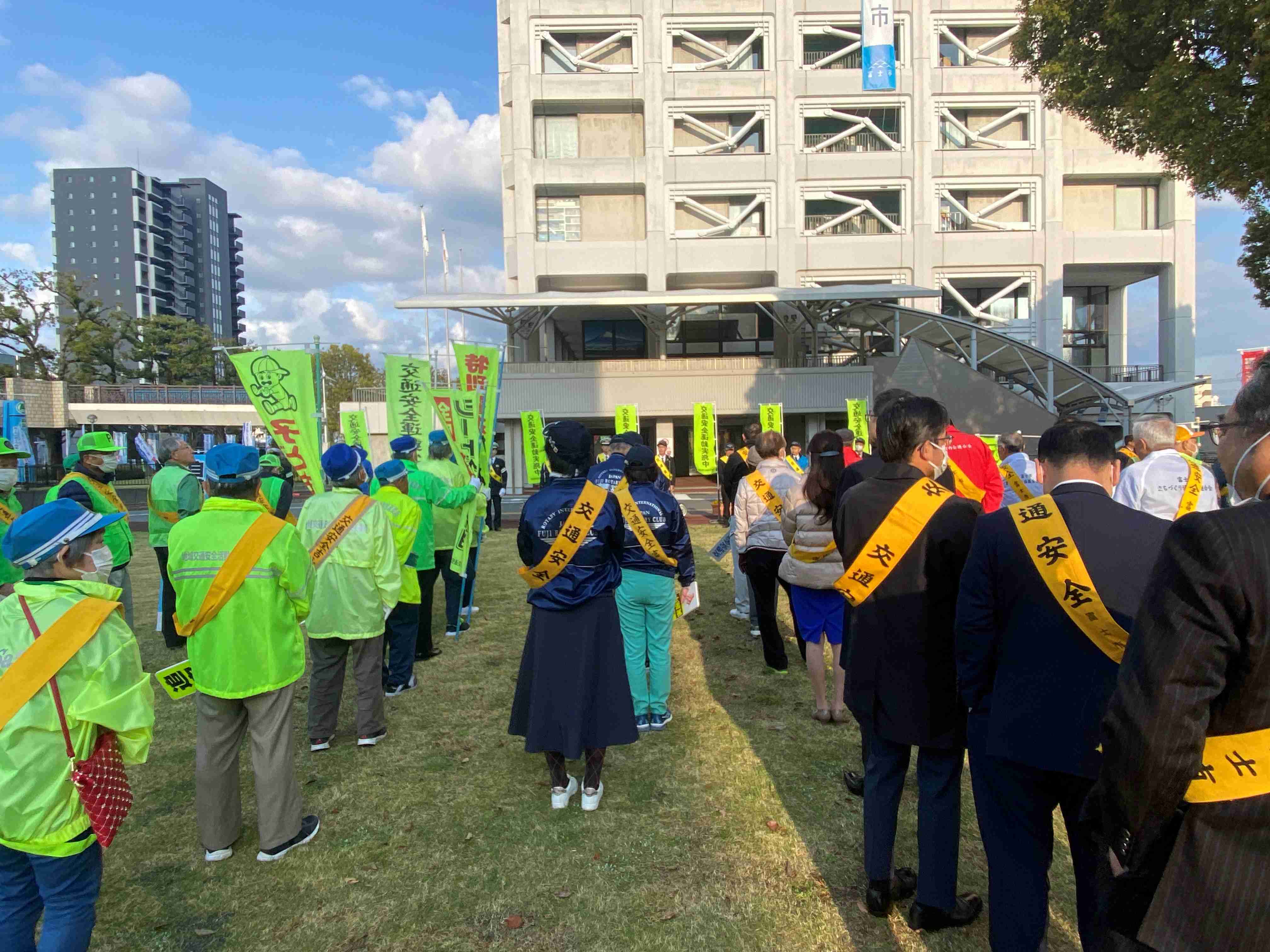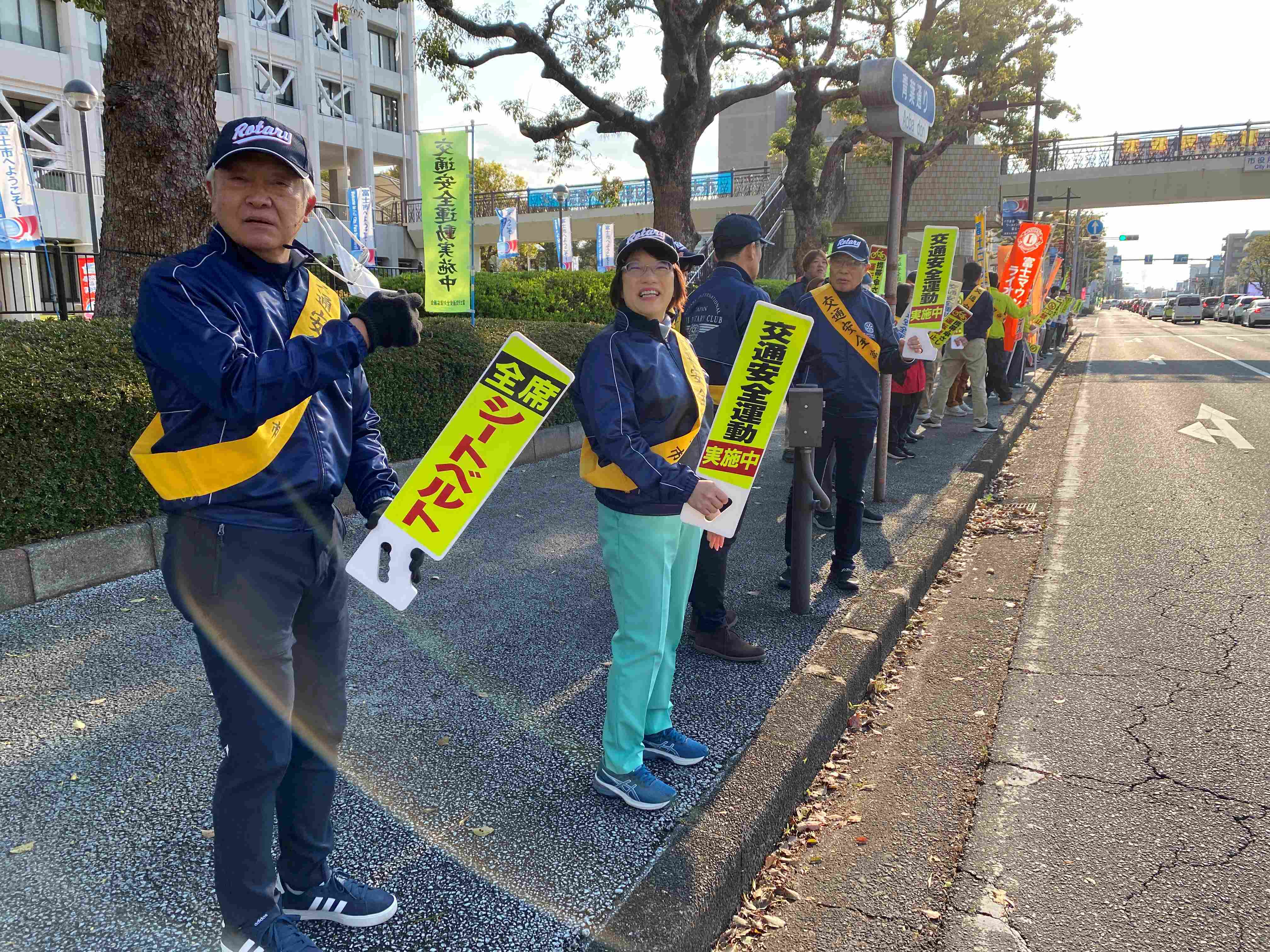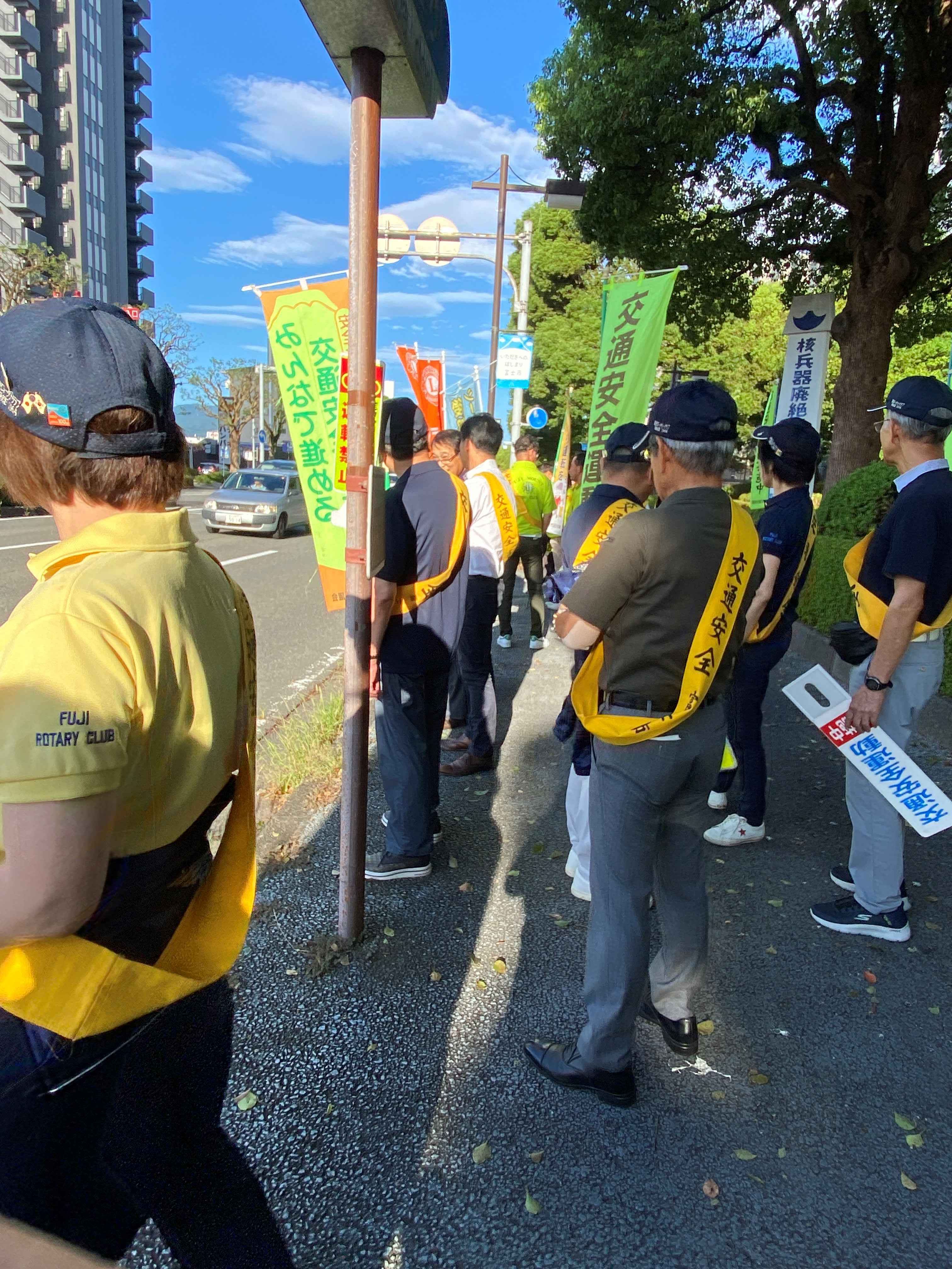 雨が続いておりましたが、本日の朝は天気が快晴。午前7:00から予定通り行われました。富士市内のさまざまな団体が参加しまして、富士市役所周辺の道路・交差点に立ち、通勤時の車両や通学の方々に交通安全の発信をします。