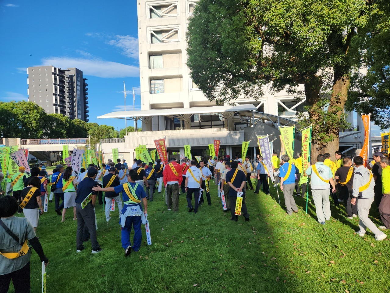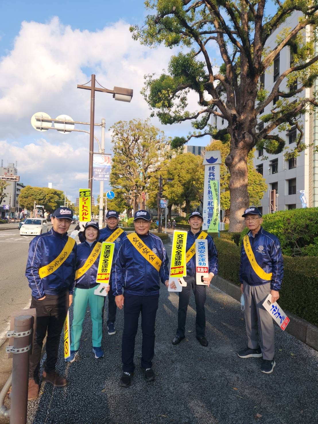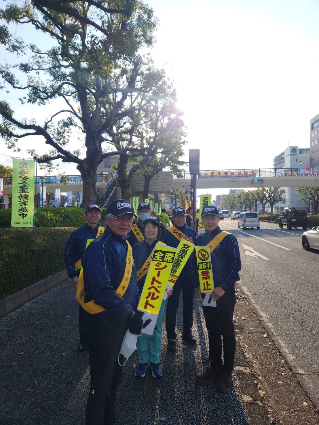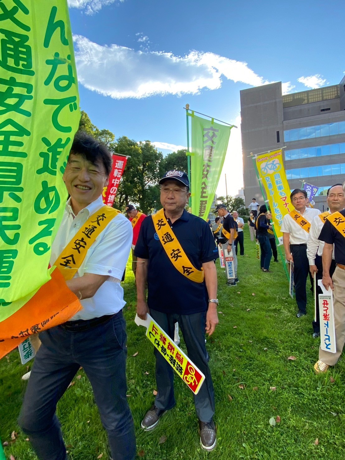 雨が続いておりましたが、本日の朝は天気が快晴。午前7:00から予定通り行われました。富士市内のさまざまな団体が参加しまして、富士市役所周辺の道路・交差点に立ち、通勤時の車両や通学の方々に交通安全の発信をします。
