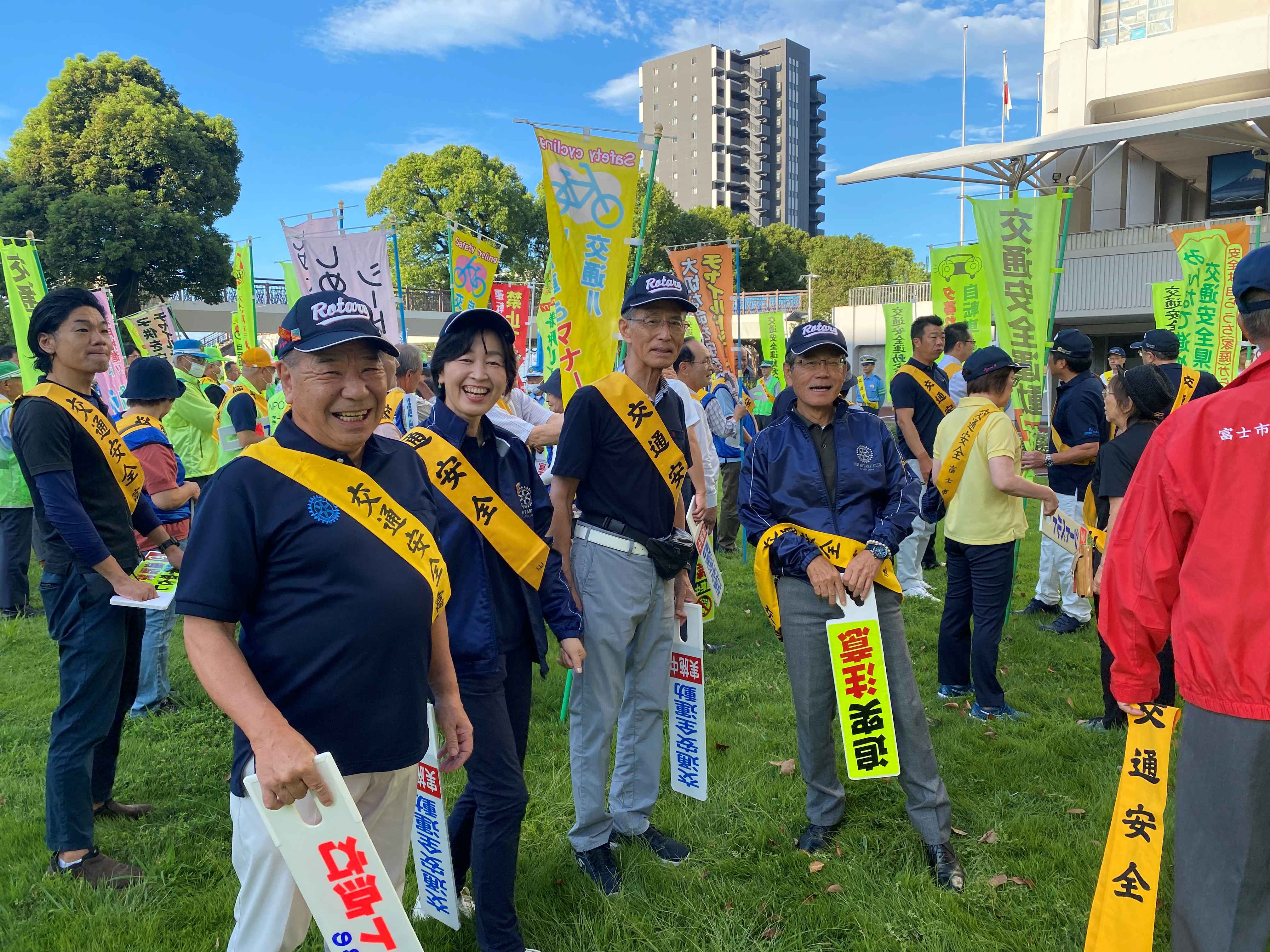 雨が続いておりましたが、本日の朝は天気が快晴。午前7:00から予定通り行われました。富士市内のさまざまな団体が参加しまして、富士市役所周辺の道路・交差点に立ち、通勤時の車両や通学の方々に交通安全の発信をします。